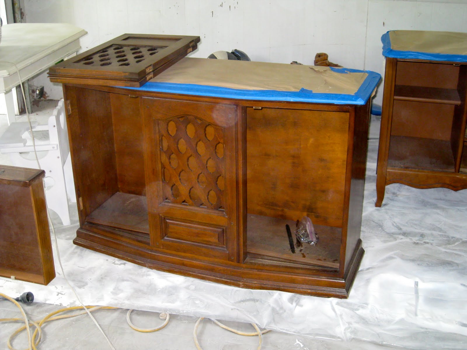 Please excuse the sander cord! The grain on the top of the piece was gorgeous, so I knew right away I was going to stain the top. However, the thought of stripping & sanding around all that woodwork on the front was a little to much to handle for me. So, after stripping & sanding the top, I covered it with butcher paper & tape to protect it, then painted the bottom.